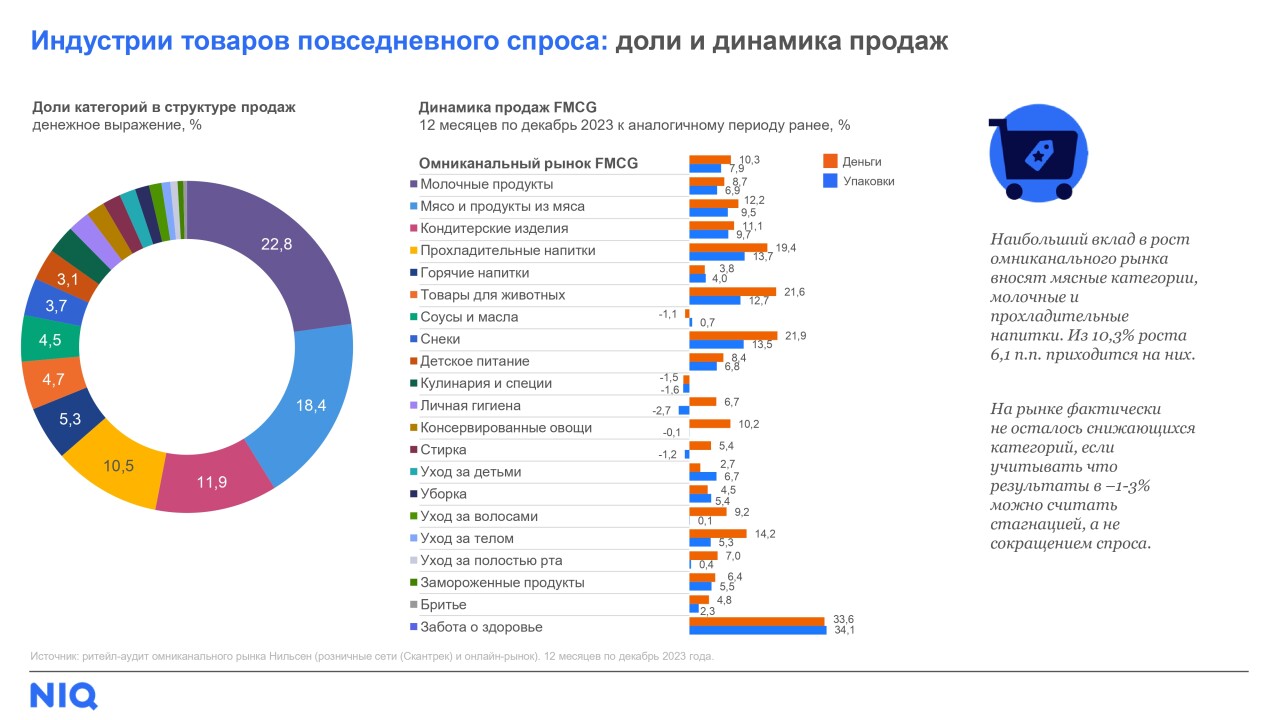 Рынок FMCG в 2023 г. вырос на 7,2% в денежном выражении по сравнению спрошлым годом — 1,2 п. п. роста обеспечено реальным спросом, а 6 п. п. —инфляцией. В натуральном выражении рынок товаров повседневного спросавосстановился после прошлогоднего падения: рост продаж в упаковках составил3,2% против падения на 2,6% годом ранее, согласно данным NielsenIQ.