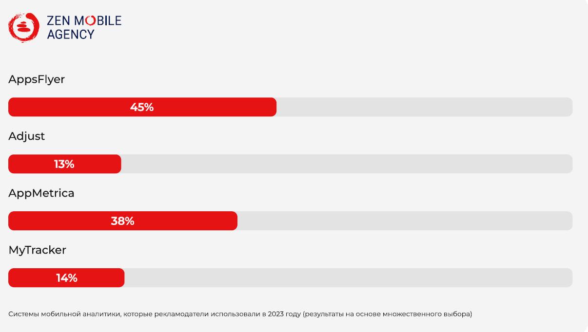 В качестве системы мобильной аналитики большинство рекламодателейиспользовали в 2023 г. AppsFlyer — 45%, AppMetrica — 38%, MyTracker — 14% иAdjust — 13%.