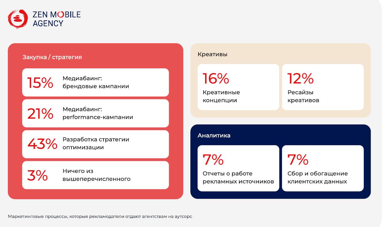 Большинство рекламодателей — 43% — готовы отдать агентствам на аутсорсразработку стратегии оптимизации, 21% — медиабаинг: performance-кампании, 16% —креативные концепции, 15% — медиабаинг: брендовые кампании. В меньшей степенирекламодатели готовы передать на аутсорс отчетность о работе рекламныхисточников и сбор и обогащение клиентских данных — за эти вариантыпроголосовали по 7%.
