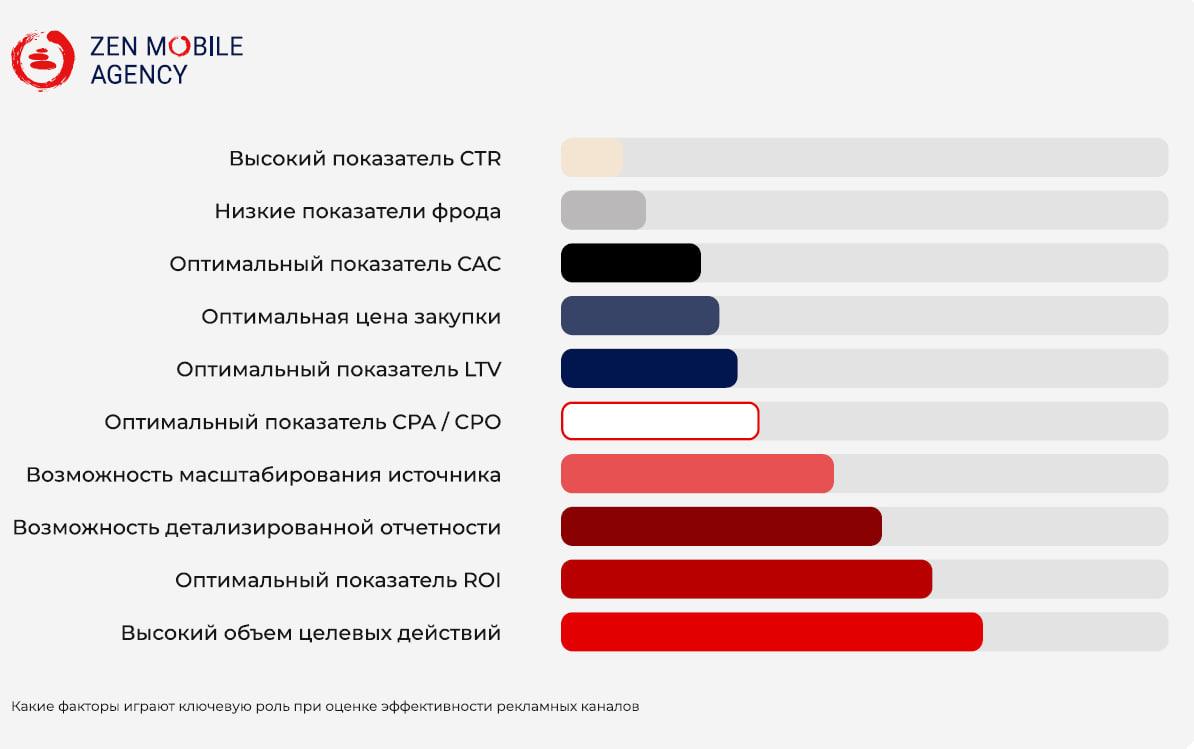 В топ факторов, которые в большей степени влияют на оценку эффективностирекламных каналов, вошли показатель объема целевых действий, ROI («Return OnInvestment», коэффициент рентабельности инвестиций) и возможностьдетализированной отчетности.