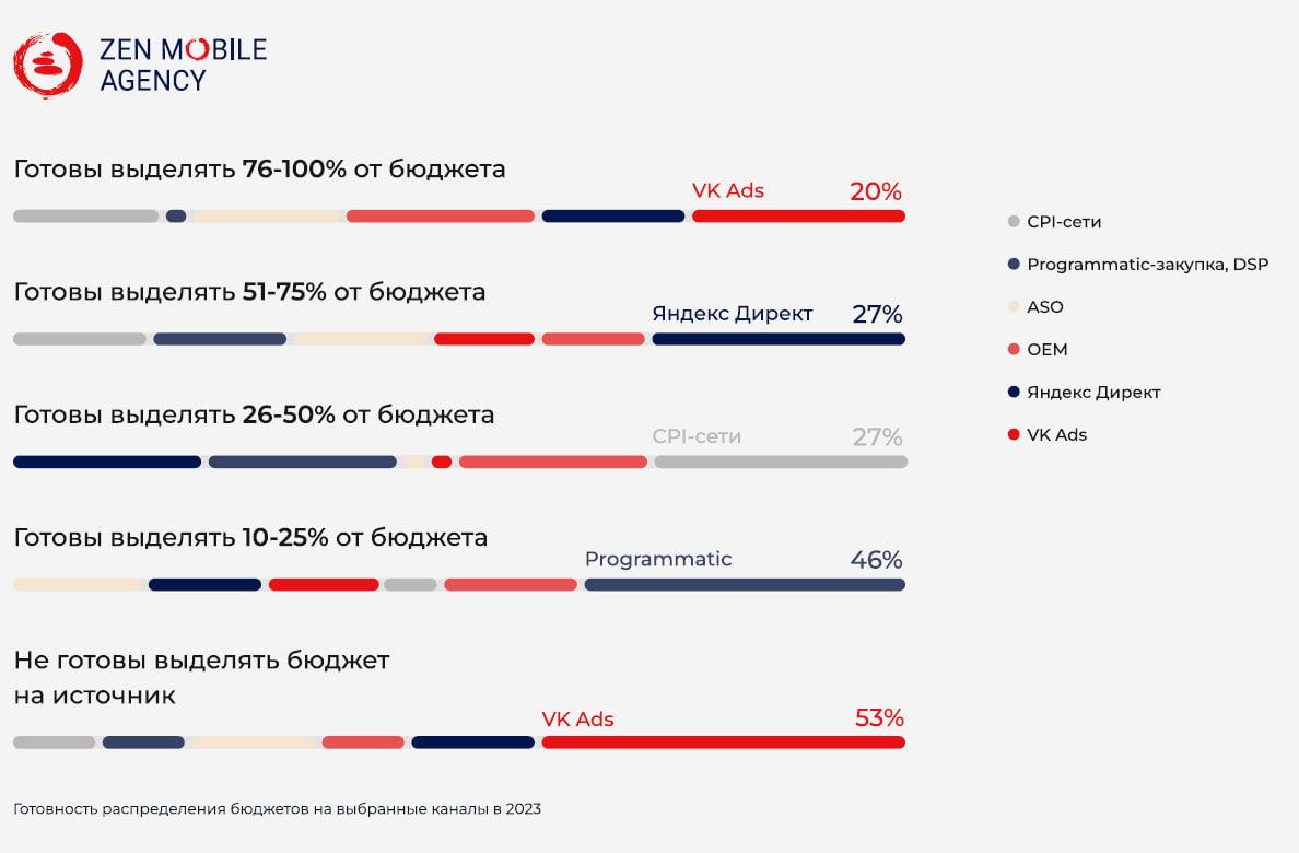 По результатам опроса 20% рекламодателей готовы были выделить максимальнуюсумму от рекламного бюджета (76–100%) на VK Ads. При этом 53% опрошенных вообщене готовы выделять деньги на этот источник трафика. Около 27% респондентовготовы были отдать 51–75% от рекламного бюджета на «Яндекс Директ», столько жереспондентов — на CPI-сети, но меньшую сумму — 26–50% от рекламного бюджета.Практически половина респондентов (46%) готовы инвестировать вprogrammatic-закупку, однако на это они готовы выделить 10–25% бюджета.