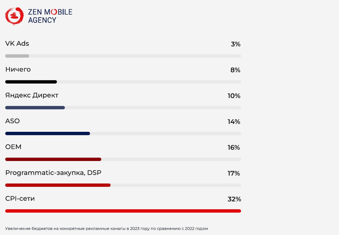 В 2023 г. большинство респондентов — 32% — увеличили бюджет на CPI-сети.Следом идут такие источники, как DSP (programmatic-закупка) — 17%, OEM — 16%.Около 14% опрошенных увеличили бюджет на ASO, 10% — на «Яндекс Директ», 3% — наVK Ads. При этом 8% респондентов вообще не повышали бюджет ни на какиерекламные каналы.