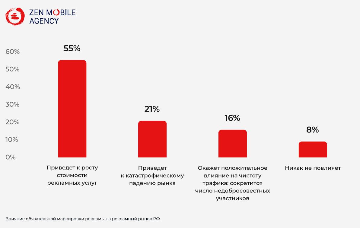 Более половины рекламодателей (55%) считают, что из-за обязательноймаркировки стоит ждать роста стоимости услуг. Около 21% предполагают, что законприведет к падению рынка. Однако 16% уверены, что эти изменения положительноповлияют на чистоту трафика и уменьшат количество недобросовестных участников.А 8% респондентов считают, что закон о маркировке рекламы никак не повлияет нарынок.