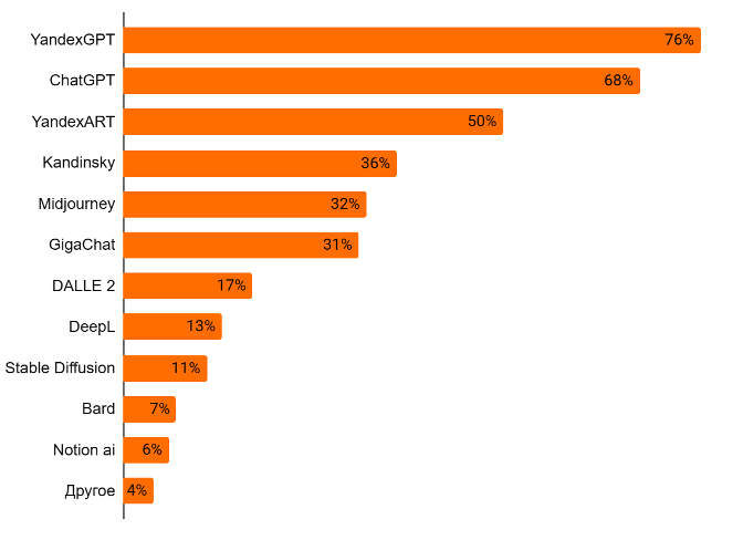 Около 77% пользователей нейросетей применяют их как минимум несколько раз вмесяц, а каждый десятый — ежедневно. Почти две трети респондентов (60%)планируют в будущем году пользоваться нейросетями чаще. Самые известные сервисы— YandexGPT, ChatGPT, YandexART, Kandinsky.
