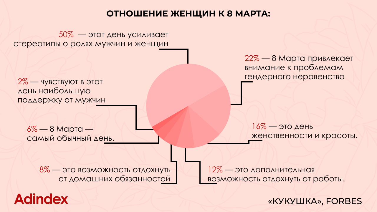 Около 20% женщин в России равнодушны к 8 Марта или относятся к этому днюскептически, пишетForbes со ссылкой на опрос платформы «Кукушка». Более 45%респонденток заявили, что им нравится идея праздника, 18% считают 8 Мартаважной датой, 16% искренне любят этот день.