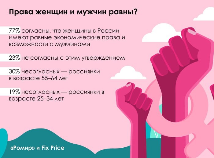По данным «Ромир» и Fix Price, 77% россиянок «полностью согласны» и «скореесогласны» с утверждением, что женщины в России имеют равныеэкономические права и возможности с мужчинами. Не согласны с этимутверждением 23%. Наибольший процент несогласных — россиянки в возрасте 55–64лет (30%), а наименьший — среди тех, кому 25–34 года (19%).