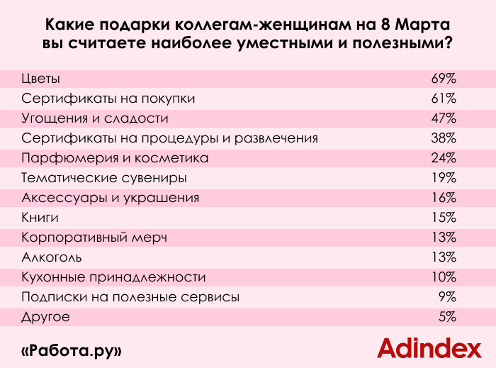 Самым уместным и полезным подарком коллегам-женщинам большинство опрошенных(69%) назвали цветы. 61% респондентов выбирают сертификаты на покупки, а 47% —угощения и сладости. 38% респондентов выделили сертификаты на процедуры иразвлечения, 24% — парфюмерию и косметику, а 19% участников опроса отметилитематические сувениры. 16% россиян в качестве подарка коллегам выбрали быаксессуары и украшения, 15% — книги.
