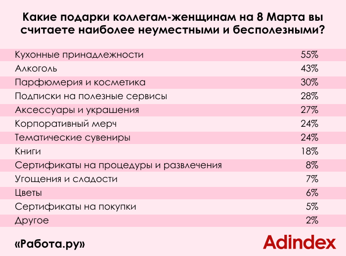 В то же время 55% респондентов отметили, что кухонные принадлежности— самый неуместный подарок для женщин-коллег. 43% опрошенных выделилиалкоголь, 30% — парфюмерию и косметику, 28% — подписку на сервисы, 27% —аксессуары и украшения. Еще по 24% опрошенных уверены, что не стоит даритькорпоративный мерч и тематические сувениры, а 18% отмечают книги.