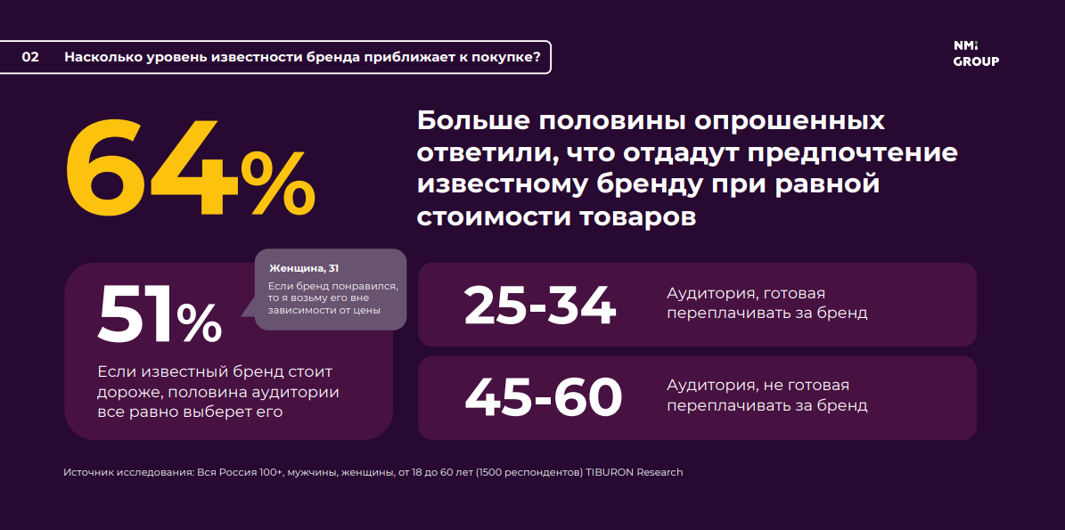 В ответе на вопрос: «Насколько уровень известности брендаприближает к покупке» 64% респондентов заявили, что отдадут предпочтениеизвестной марке при прочих равных условиях.