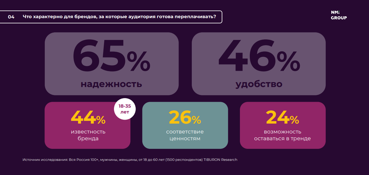 При прочих равных респонденты готовы больше платить за бренд, если онотвечает критерию надежности, — этот фактор важен для 65% опрошенных. При этоммолодая аудитория (18–35 лет) скорее будет ориентироваться на известностьмарки, отметила Михеева. Также потребителям важно соответствие бренда ихценностям (26%) и возможность оставаться в тренде (24%).