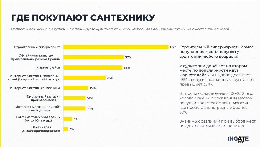 Офлайн-ретейл стал наиболее популярным местом для выбора и покупкисантехники и мебели для ванной комнаты среди опрошенных россиян.Большинство покупателей предпочитают строительные гипермаркеты, такие как«Петрович», Obi, «Леруа Мерлен» — 65%, затем следуют офлайн-магазины с разнымибрендами сантехники — 37%, согласно данным опроса Ingate Group иVitrA.