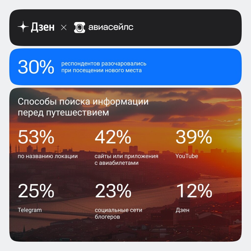Около 25% опрошенных россиян ищут информацию о путешествиях в «Телеграме»,соцсети у блогеров изучают 23% респондентов, а каналы в «Дзене» — 12%. Почти40% смотрят авторские каналы о путешествиях в YouTube, согласно данным опросаплатформы «Дзен» и «Авиасейлс».