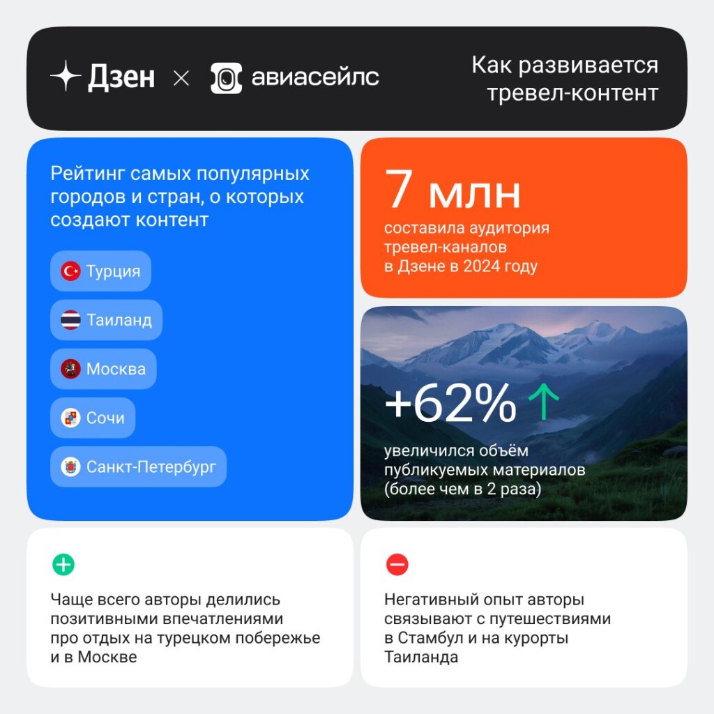 В рейтинг самых популярных городов и стран, о которых создают контент, вошлиТурция, Таиланд, Москва, Сочи и Санкт-Петербург. Чаще всего авторы делилисьпозитивными впечатлениями про отдых на турецком побережье и в Москве.Негативный опыт авторы связывают с путешествиями в Стамбул и на курортыТаиланда.