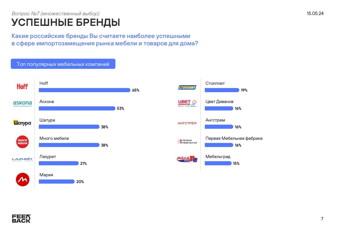 В качестве наиболее успешных брендов мебели и товаров для дома 65% россиянвыбрали Hoff, 53% — «Аскону» и 38% — марки «Шатура» и «Много мебели». Бренды«Лазурит» и «Мария» выбрали 21 и 20% респондентов соответственно.