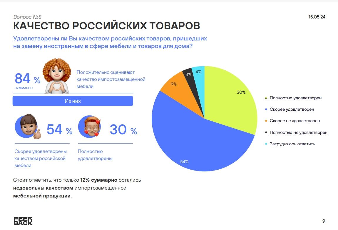 Почти 85% оценили качество российской мебели и товаров для домаположительно. Из них 30% полностью довольны отечественными товарами, 54%выбрали вариант «скорее удовлетворены».