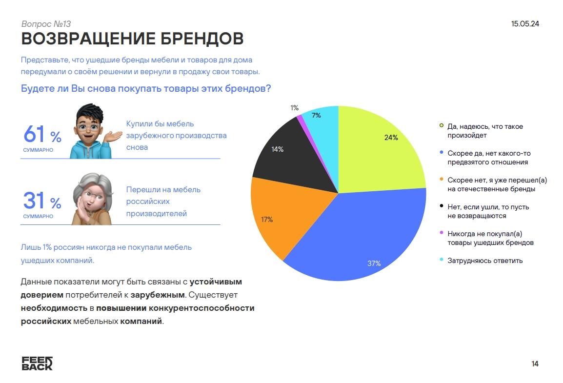 Большинство опрошенных россиян начали бы покупать товары иностранных брендовв случае их возвращения. Более 60% положительно относятся к ушедшимпроизводителям, из них 37% не имеют предвзятого отношения, а 24% надеются навозвращение этих брендов, согласно данным исследовательского центра«Фидбэк».