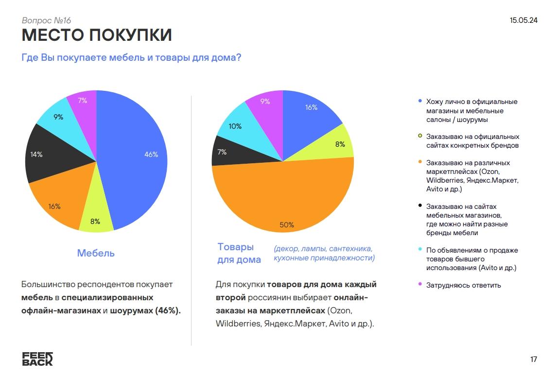Большинство опрошенных — 46% — заявили, что мебель покупают только вспециализированных магазинах или шоурумах. В то же время такие предметы быта,как лампы, декор, сантехнику и прочие подобные товары половина респондентовпредпочитают заказывать онлайн.