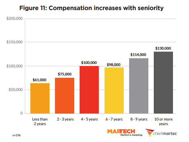 Медианная зарплата специалистов в области маркетинговых технологий составилапочти $130 тыс. в 2024 г., говорится вглобальном отчете 2024 MarTech Salary and Career Survey(«2024 опрос о зарплате и карьере в MarTech») от MarTech.org и Сhiefmartec.com.По данным опроса, чтобы достичь такого дохода необходимо проработать около 10лет.