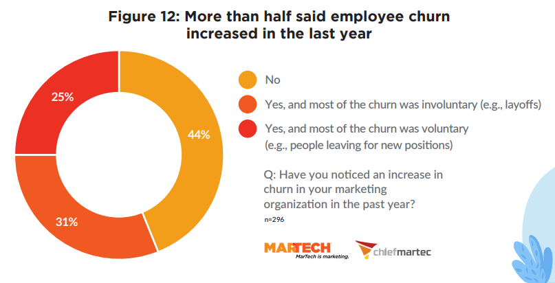 Более половины специалистов из области MarTech (56%) заявили, что в 2024 г.отток сотрудников в их компаниях увеличился. Почти треть опрошенных отметили,что сокращение количества работников было «вынужденным».