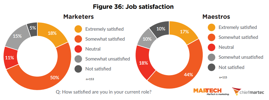 За последний год увеличилось количество неудовлетворенных своей работойспециалистов в сфере маркетинговых технологий. Показатель вырос до 21% посравнению с 12% в 2023 г.