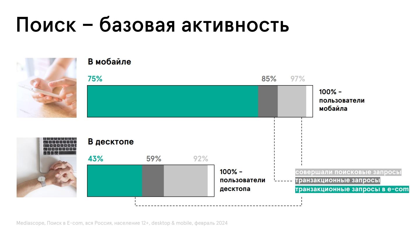 Абсолютное большинство как мобильных (97%), так и десктопных пользователей(92%) совершают хотя бы один поисковый запрос любого типа за месяц.«Транзакционные поисковые запросы в отношении товаров также относятся кбазовым привычкам: во всех типах ресурсов их совершают 85% мобильныхпользователей и 59% пользователей десктопа, а непосредственно на e-сомплощадках (включая приложения) 75% и 43% пользователей соответственно», —отмечается в исследовании.