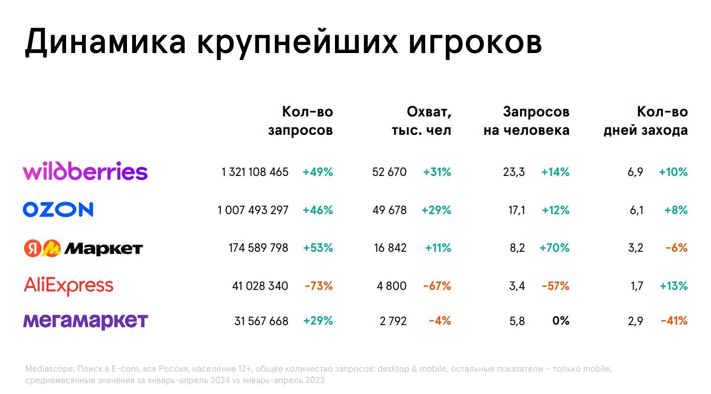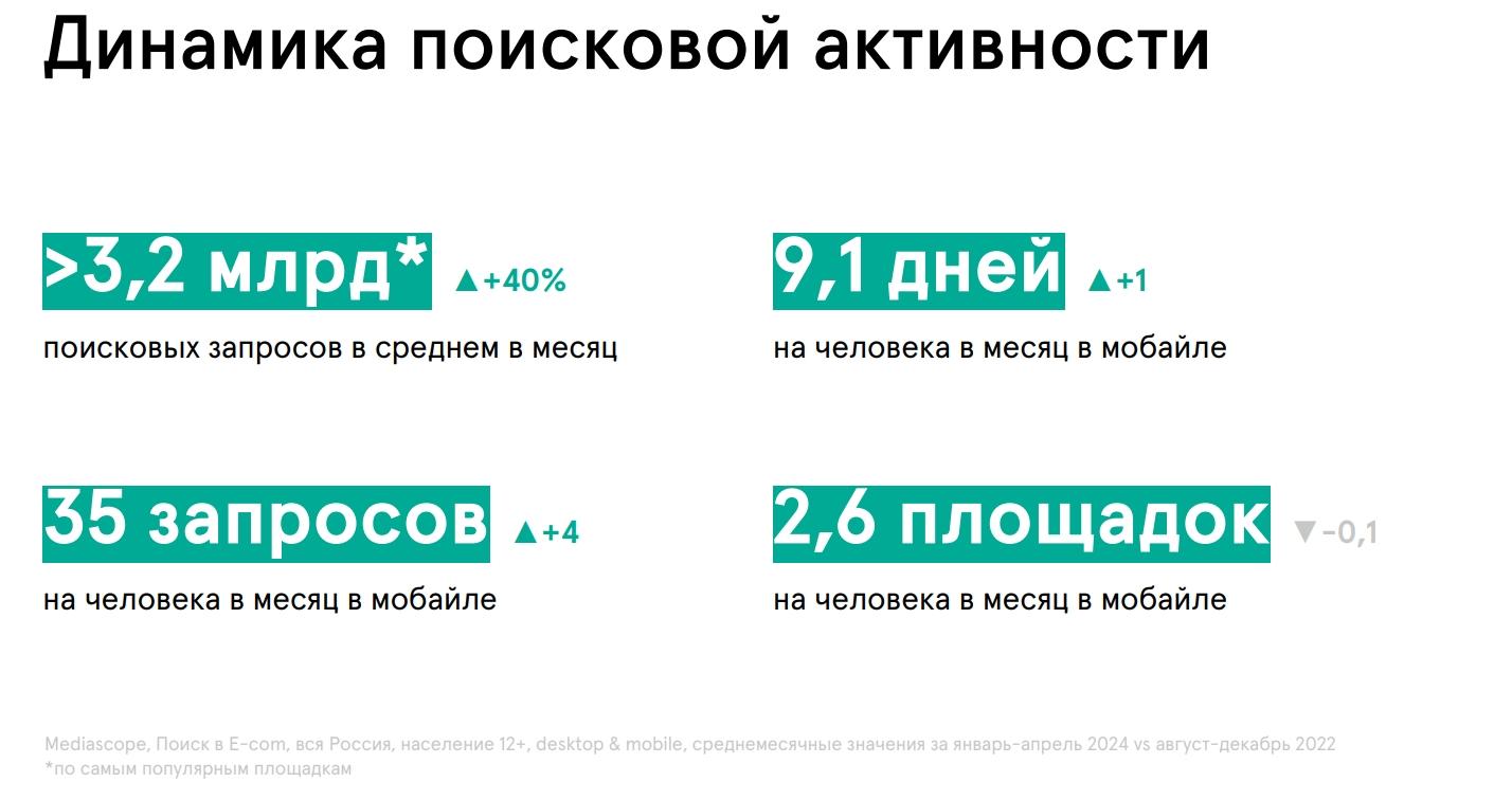 Поисковая активность в e-сом в начале 2024 г. продолжает заметно расти повсем показателям. Число запросов в месяц за полтора года увеличилось на 40% —до 3,2 млрд штук, согласно данным Mediascope.