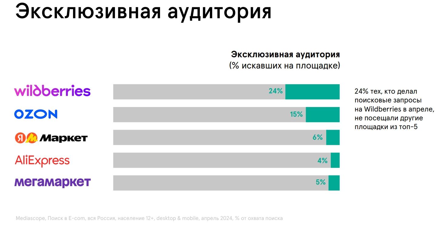 При этом на рынке сохраняется высокая конкуренция — пользователи сравниваютпредложения и выбирают товар на нескольких ресурсах. Доля эксклюзивнойаудитории (тех, кто ищет товары только на одном из пяти крупнейшихмаркетплейсов — Wildberries, Ozon, «Яндекс Маркет», Aliexpress, «Мегамаркет»)от 5% («Мегамаркет») до 24% (Wildberries).