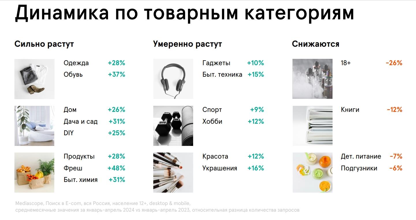 Рост числа поисковых запросов происходит у большинства товарных категорий.Быстрее всего растут одежда, обувь, дом, дача и сад, DIY, продукты и бытоваяхимия. Однако есть и категории, в которых число поисковых запросов в среднем замесяц снижается, к ним относятся товары для курения, бумажные книги, детскоепитание и подгузники.