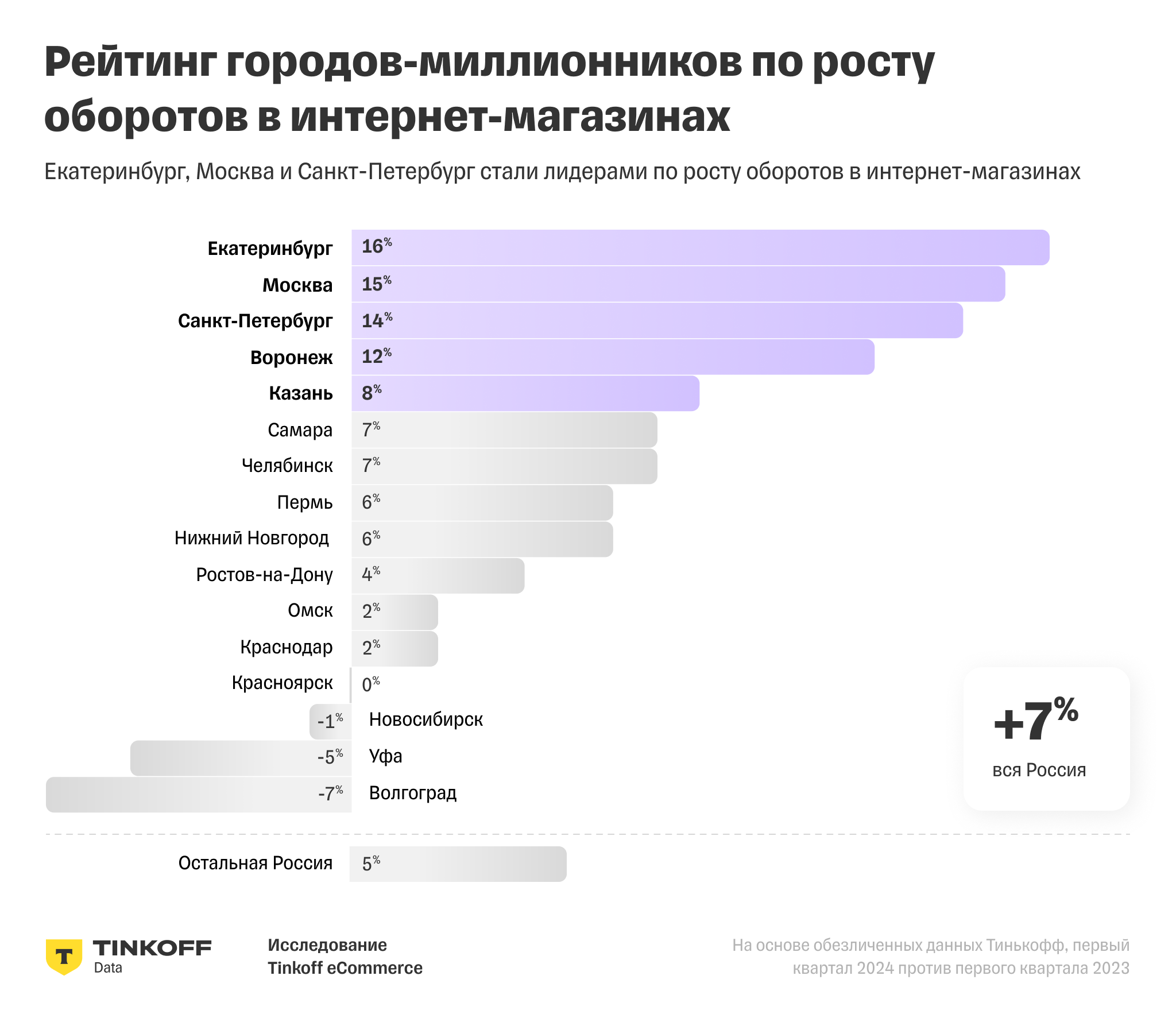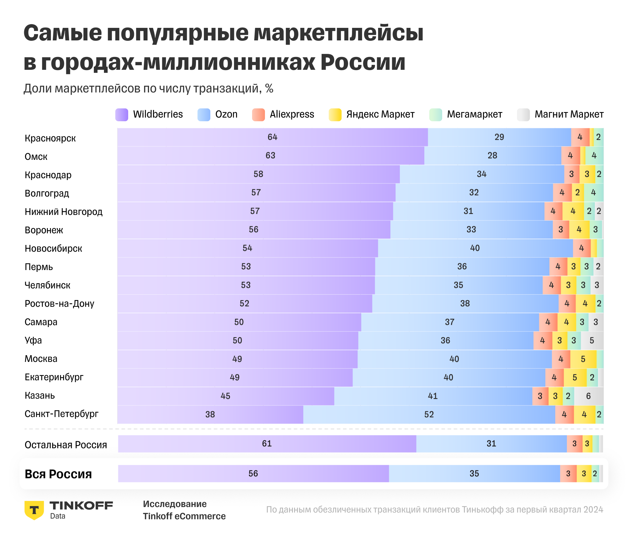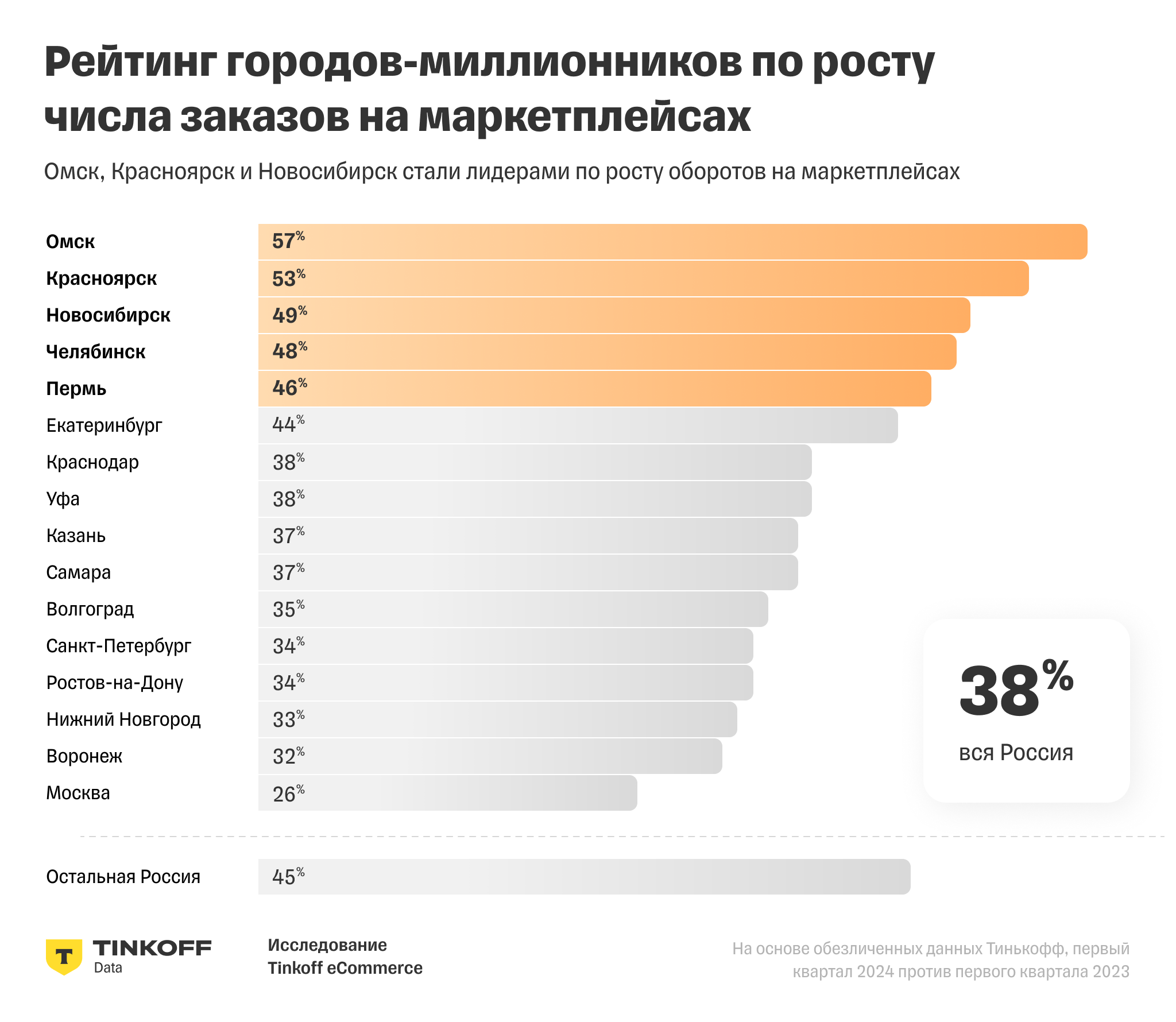 Омск, Красноярск и Новосибирск вошли в тройку лидеров по росту оборотов намаркетплейсах по итогам первого квартала 2024 г. Рост составил 64, 63 и 56%соответственно, согласно данным Tinkoff eCommerce.