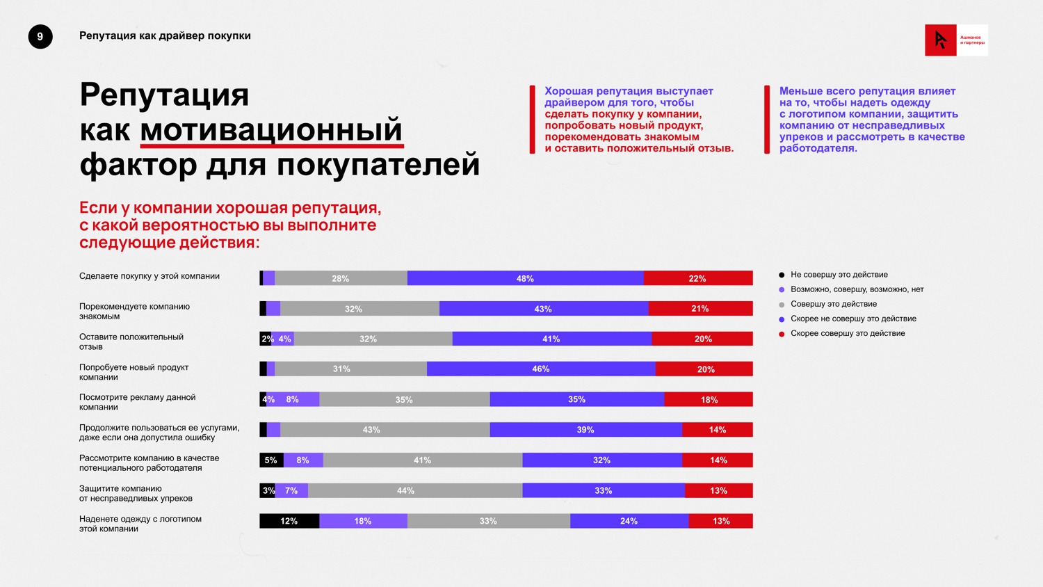 «Компании, обладающие сильной репутацией, вызывают у покупателей чувствосопричастности. Покупатели выражали высокую готовность совершать действия, несвязанные напрямую с покупками, например, защитить компанию, простить ейошибку, посмотреть ее рекламу и так далее. Наиболее мотивирующее воздействиерепутация оказывает на молодых людей (18-24 лет)», — говорится висследовании.