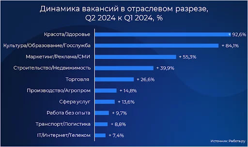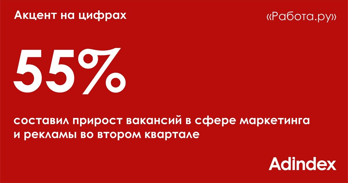 Сфера маркетинга и рекламы заняла третье место по приросту числа вакансий вовтором квартале 2024 г. Эта отрасль увеличилась на 55% по сравнению с первымкварталом. Лидером рейтинга стала область красоты и здоровья — рост на 92%, навтором месте — сфера культуры и образования — на 84%, согласно данным«Работы.ру».