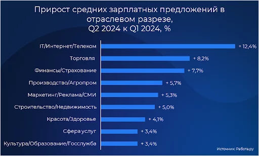 Кроме того, в IT и телекоме увеличились зарплатные предложения. Во второмквартале этот показатель вырос на 12%. В сфере торговли прирост составил 8%, вфинансовой и страховой отрасли — 7,7%.Также зарплаты стали больше впроизводстве и агропроме — рост на 5,7%, маркетинге и рекламе — на 5,3%,строительстве и недвижимости — на 5%.