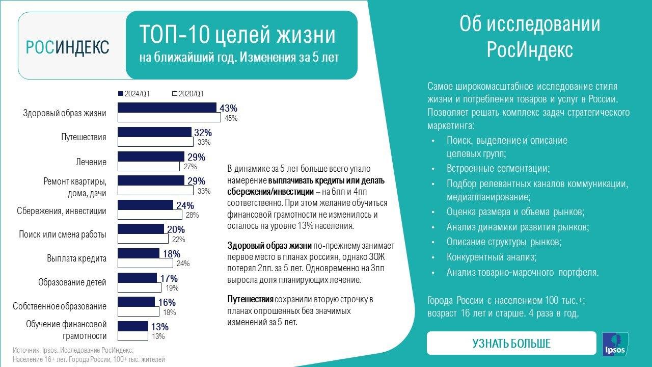 Что важно для россиян, какие цели они ставят на ближайший год и что из приоритетов изменилось за пять лет — выяснили аналитики Ipsos в исследовании «РосИндекс»