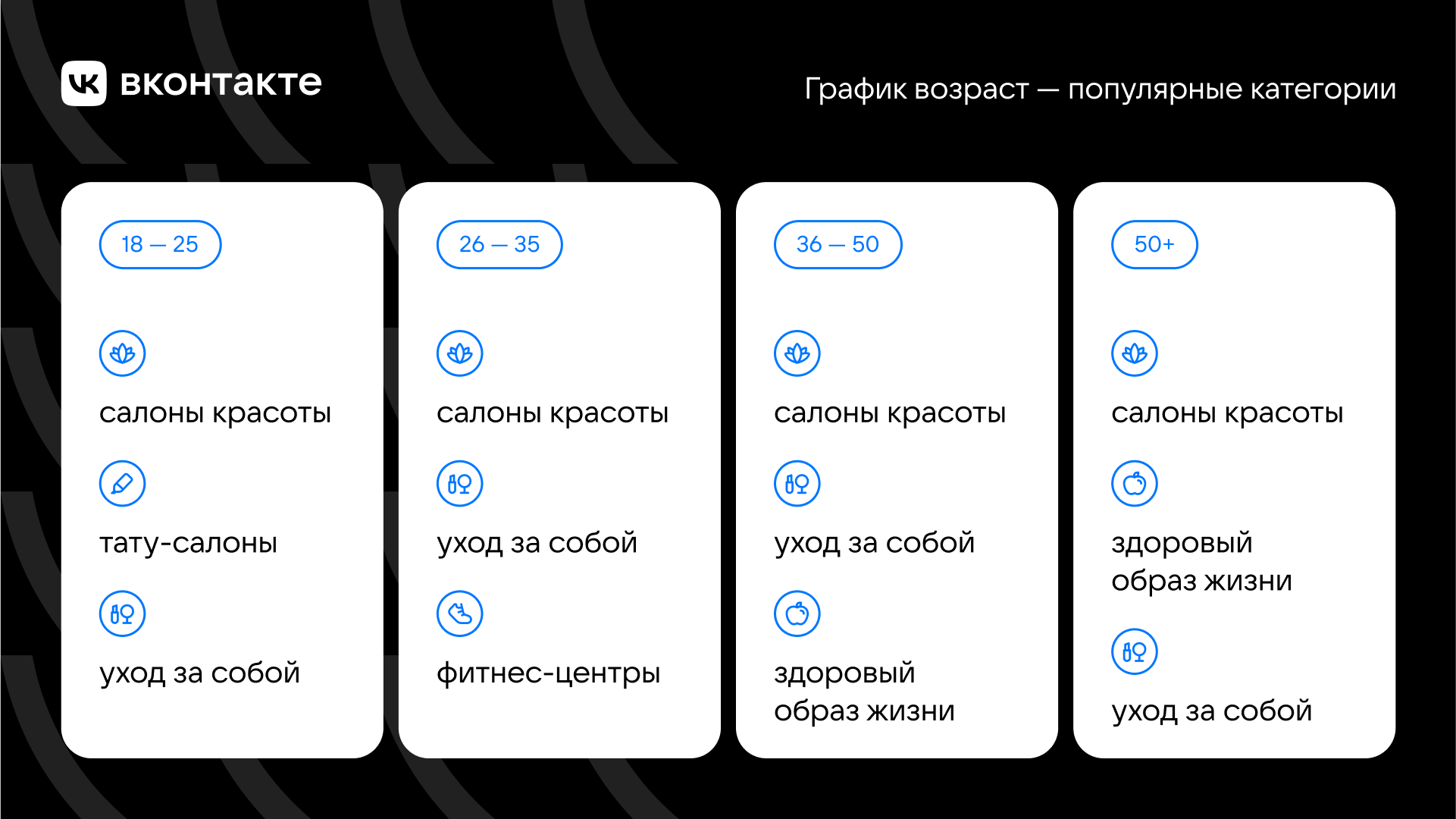 Женщины в соцсети чаще просматривают сообщества салонов красоты, а такжепаблики, посвященные уходу за собой и здоровому образу жизни. В топе товаров иуслуг — уход за волосами, парфюмерия и макияж.