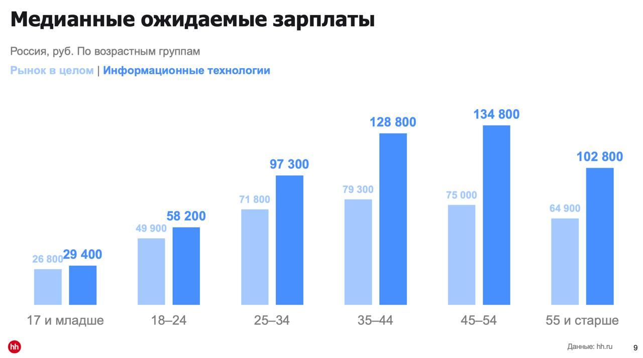 Медианные ожидаемые зарплаты для россиян в возрасте 18-24 лет составили 49,9тыс. руб. в целом, а для тех, кто постарше (25-34 лет) — 71,8 тыс. руб.