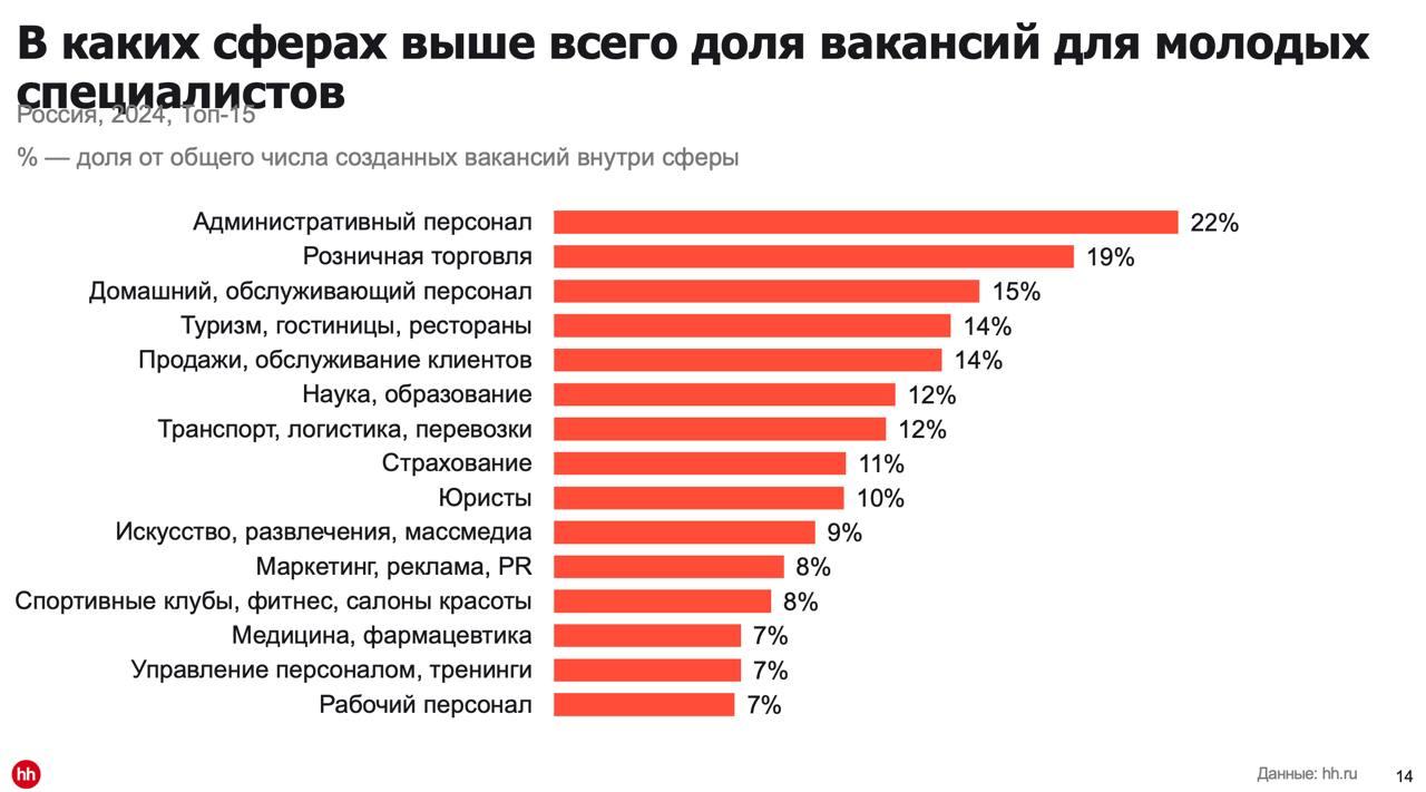 Больше всего вакансий для молодых специалистов в сферах административногоперсонала (22% от общего числа созданных вакансий внутри сферы), розничнойторговли (19%), домашнего и обслуживающего персонала (15%). У маркетинга,рекламы и PR доля таких вакансий составила 8%, эта сфера делит 11 место сфитнесами, спортивными клубами и салонами красоты. Наименьший результат (7%) умедицины и фармацевтики, управления персоналом и тренингов, рабочегоперсонала.