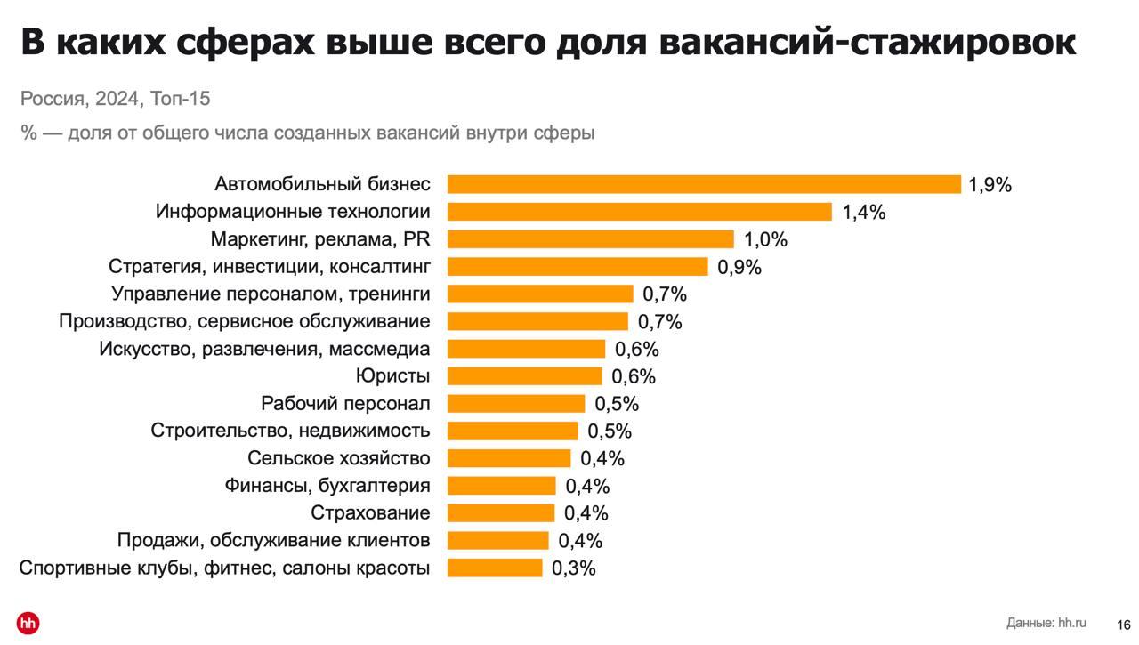 В рейтинге количества вакансий-стажировок первое место занял автомобильныйбизнес — 1,9% от общего числа созданных вакансий внутри сферы, согласноисследованию HeadHunter «Рынок молодых специалистов». На втором месте IT —1,4%. Замыкает тройку лидеров маркетинг, реклама и PR — 1%. «Магнит»,«Курьерская служба» и Aston предлагают наибольшее число стажировок. В топ такжепопали «Алабуга», «Сибур», Changellenge.