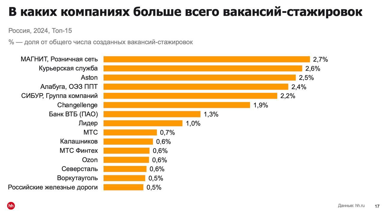 Какие компании предлагают наибольшее количество стажировок, в каких сферах больше всего вакансий и какие денежные ожидания у молодых специалистов — читайте в обзоре исследования платформы онлайн-рекрутинга HeadHunter от телеграм-канала «Траектория»