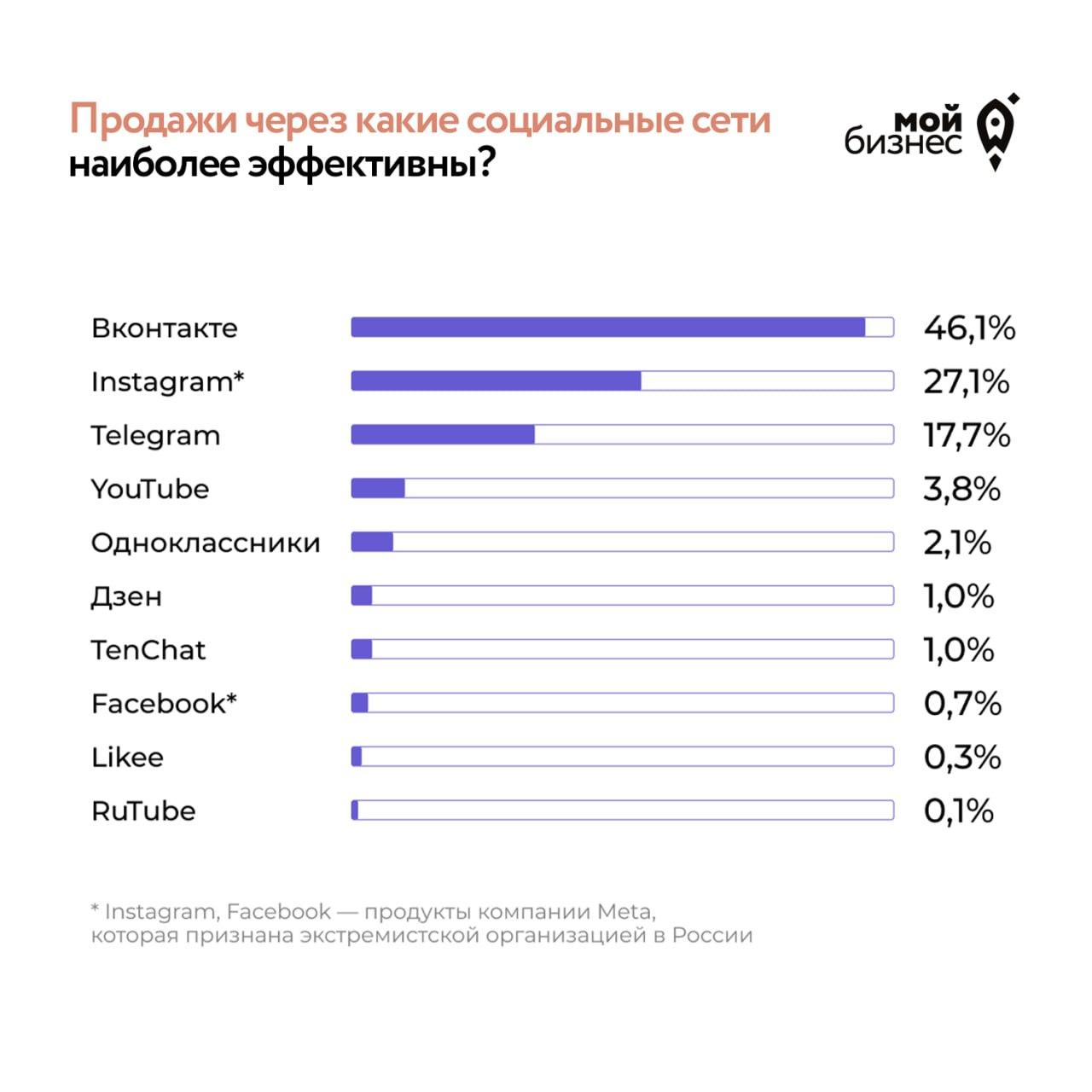 Около 46% предпринимателей отметили, что эффективнее всего товары и услугипродаются через «ВКонтакте», 27% — через Instagram*, 17,7% — через«Телеграм».