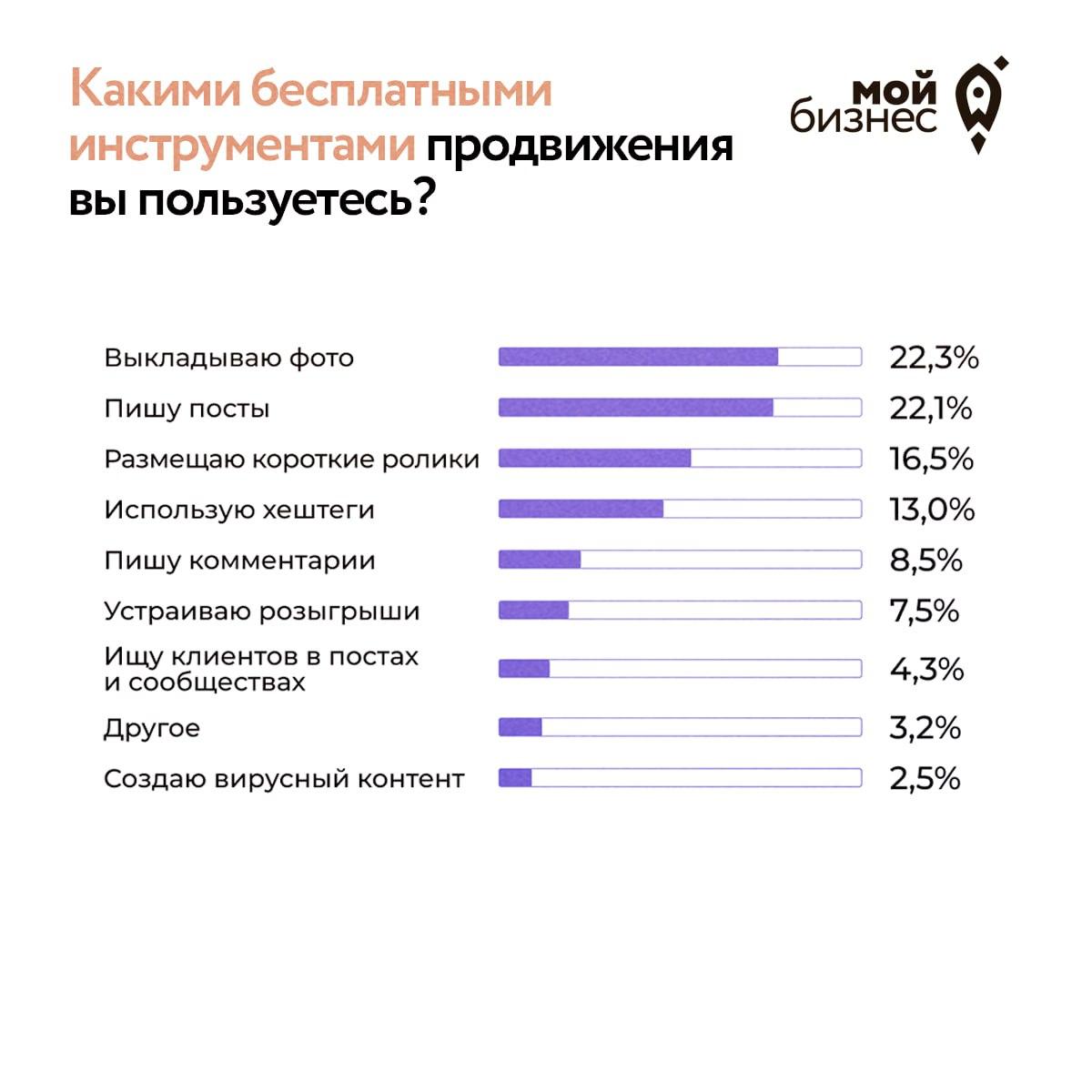 Самой популярной площадкой для продвижения товаров и услуг средипредставителей малого и среднего бизнеса стала «ВКонтакте» — ее используют38,5% опрошенных. На втором месте «Телеграм»— 23,2%, на третьем Instagram* —20,4%. В топ-5 площадок для развития бизнеса также вошли YouTube и«Одноклассники», по данным опроса Минэкономразвития и ассоциации «Мой бизнес –мои возможности».