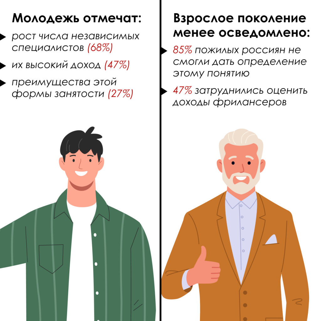 Молодые люди и самозанятые лучше других разбираются в специфике фриланса.Молодежь в возрасте 18-24 лет чаще отмечает рост числа независимых специалистов(68%), их высокий доход (47%) и преимущества этой формы занятости (27%).Взрослое поколение (60+) менее осведомлено о фрилансе: 85% пожилых россиян ввозрасте 60+ не смогли дать определение этому понятию, а 47% затруднилисьоценить доходы фрилансеров.