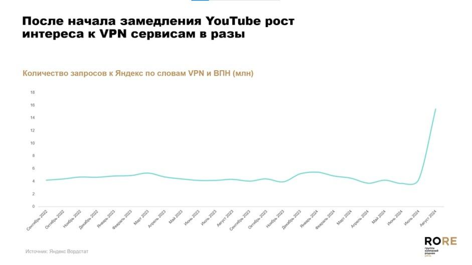 Ссылаясь на статистику «Яндекс Вордстат», спикерыконференции озвучили, что количество запросов «VPN» и «ВПН» в поисковике«Яндекс» увеличилось с 4 млн до 16 млн после начала замедления YouTube. Ранееэтот показатель держался стабильным с сентября 2022 г.