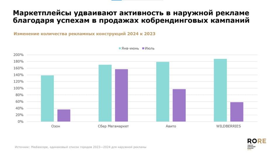 Эксперты группы компаний «Родная Речь», рассказали, что Ozon,«Мегамаркет», Avito и Wildberries удвоили активность в наружной рекламе всравнении с 2023 г. Тенденция усилилась в июле 2024 г., что связано с успешнымипродажами кобрендинговых кампаний.