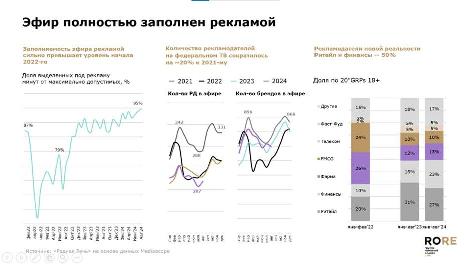 Количество рекламодателей на ТВ сократилось на 20% в 2024 г. к2021 г. Драйверами рекламы на ТВ стали ретейл и финансы.