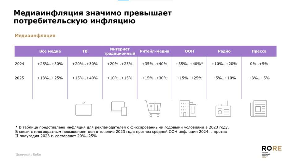 Медиаинфляция достигнет 13–25% в 2025 г.; в 2024 г.она составила 25–30%. Наибольшая инфляция ожидается на ТВ, в этом сегменте онадойдет до 15–40%. Наименьшие показатели у радио и прессы — 5–10 и 3–5%соответственно.