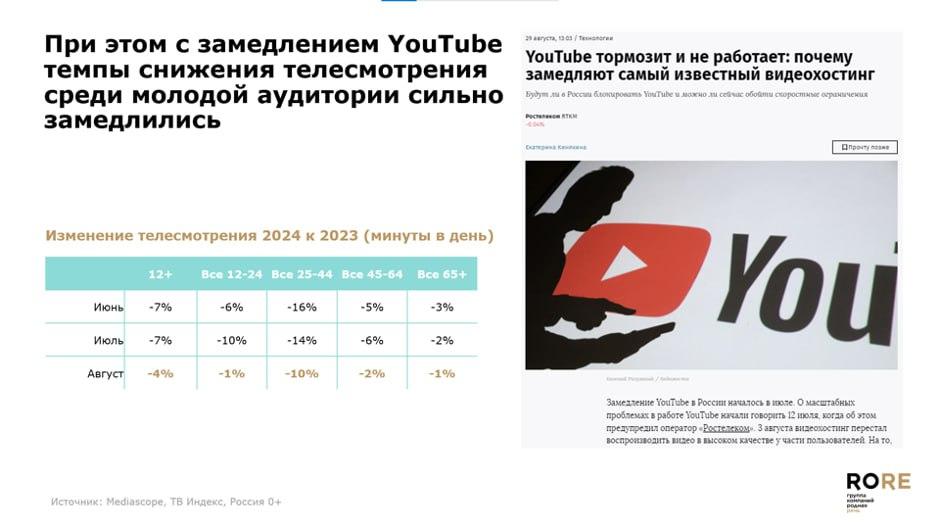 С замедлением YouTube дневная аудитория площадкисократилась на 15%, а молодежь стала больше смотреть ТВ, отмечают аналитики.Темпы снижения телесмотрения среди молодой аудитории замедлились в сравнении саналогичным периодом 2023 г. Если в июне 2024 г. представители сегмента25–44 года смотрели на 16% меньше времени по сравнению с 2023 г., то в августепоказатель достиг 10%.