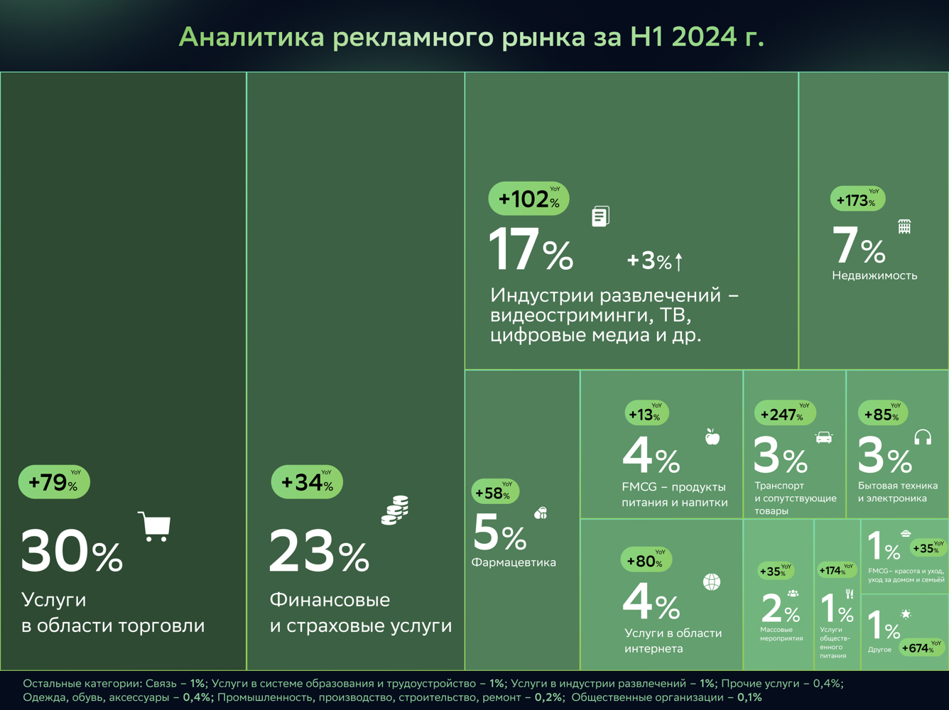 Сектор недвижимости также показал рост — рекламные бюджеты в этом сегментеувеличились на 173% по сравнению с 2023 г., что связано с активным спросом нановостройки и стремлением застройщиков охватить молодую аудиторию.
