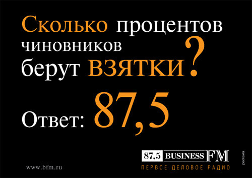 Радиостанция BusinessFM работает на частоте 87,5FM в Москве уже два года. Рекламная кампания была посвящена дню рождения радиостанции. В качестве ответов на провокационные вопросы (среди них есть, например: 'Сколько миллиардов дадут Дерипаске?' или 'Сколько дней продержится правительство?'), предлагается всегда один и тот же ответ: 87,5.