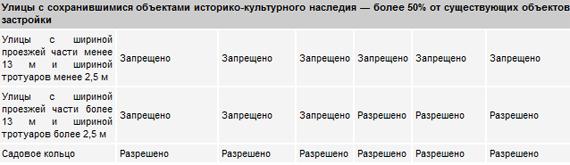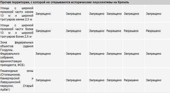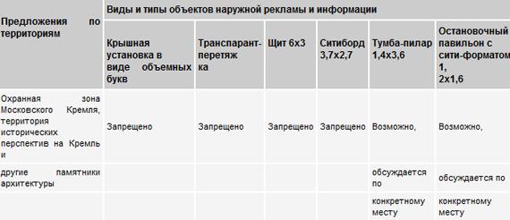 К примеру, на территории, которая дает обзор исторических перспектив Московского Кремля, допускается размещение только конструкций небольшого формата (афишный стенд, остановочный павильон, тумба-пиллар 1,4х3 м), причем решение тут должно приниматься индивидуально по каждому месту. В зоне федеральных объектов — возле зданий Государственной думы, Федерального собрания, администрации президента и ФСБ — возможна установка лишь некоммерческих указателей. На набережных — Пречистенской, Крымской, Якиманской, Болотной и других — со стороны реки могут быть установлены только остановочные павильоны, указатели и панель-кронштейны 1,2х1,8 м. Зато практически все типы рекламоносителей могут размещаться непосредственно на Садовом кольце.