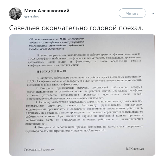 Уведомление он получил после публикации в своем микроблоге в Twitter фотографии приказа гендиректора «Аэрофлота» Виталия Савельева о запрете сотрудникам пользоваться в офисе смартфонами. В сообщении перевозчика отмечается, что Алешковский был лишен платинового статуса «в связи с публикацией негативных высказываний» в адрес авиакомпании.